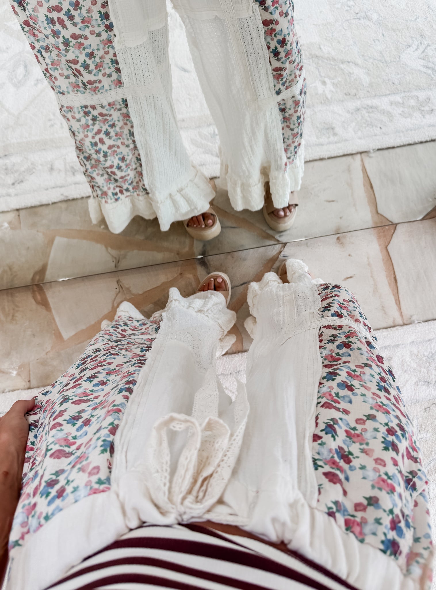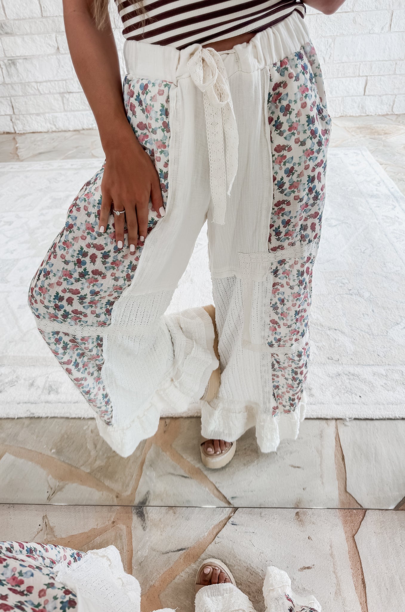 Through The Seasons Double Gauze Lace Patchwork Ruffle Pants - Natural