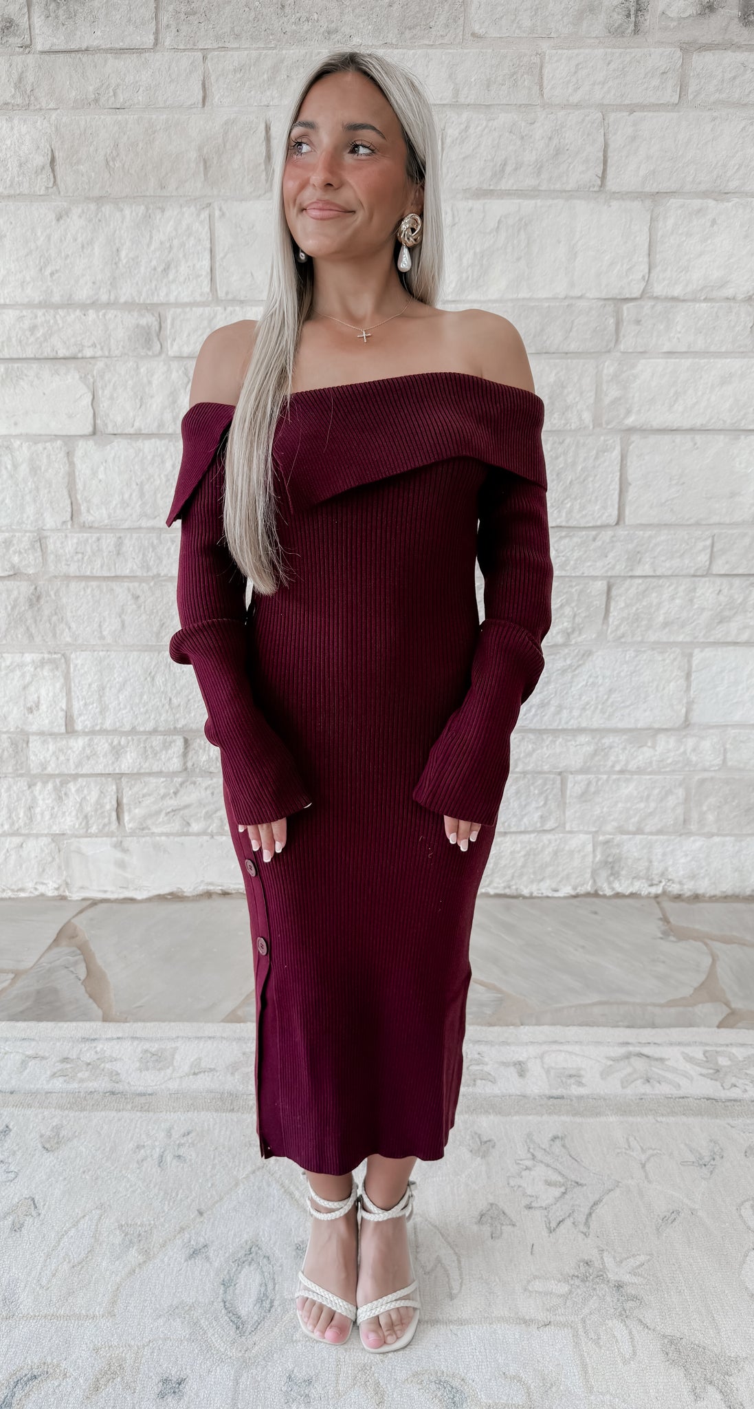 Moonlight Dinner Off The Shoulder Ribbed Knit Sweater Dress - Ruby
