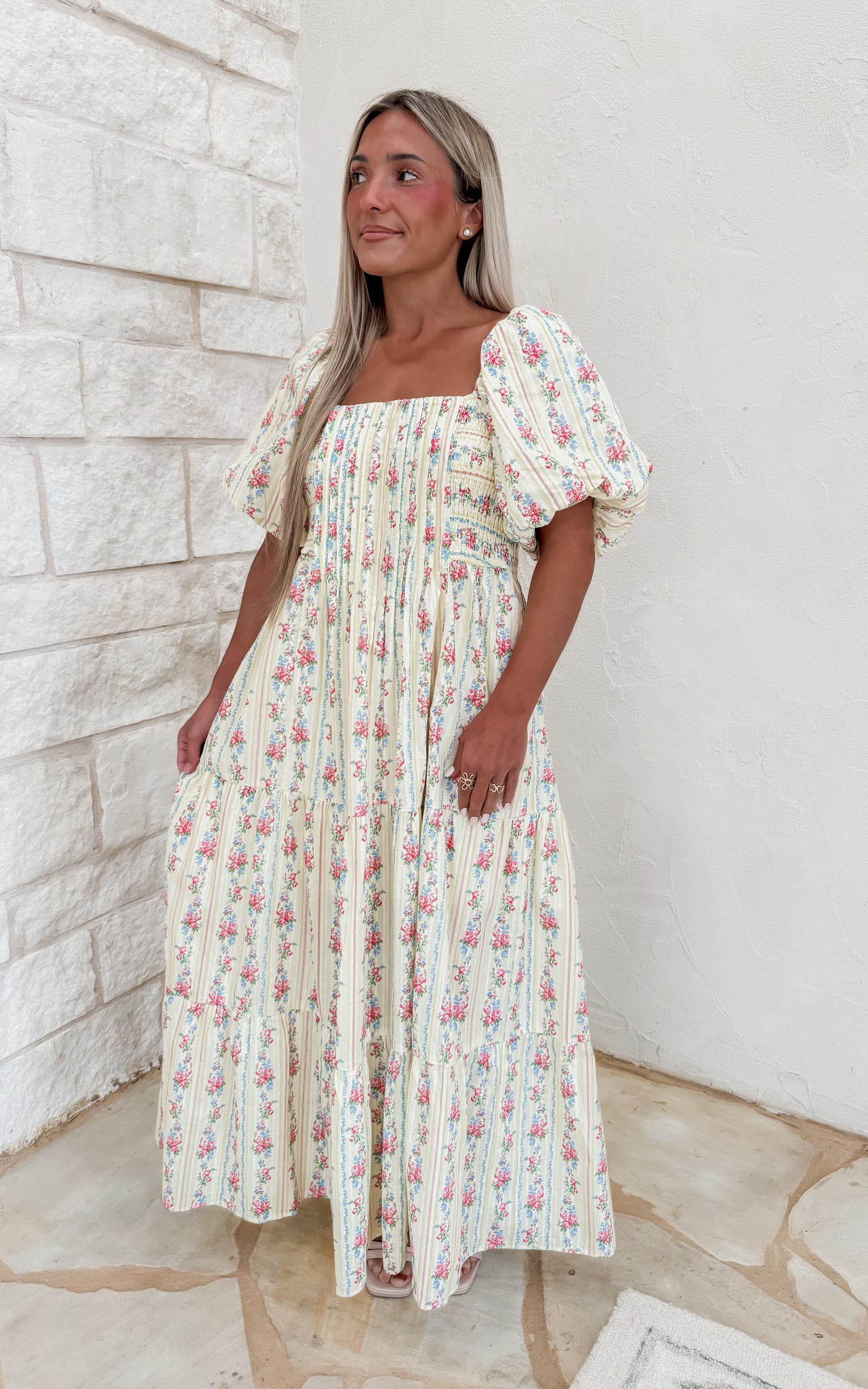 Spirit Of Spring Floral Stripe Bubble Sleeve Smocked Maxi - Lt. Yellow