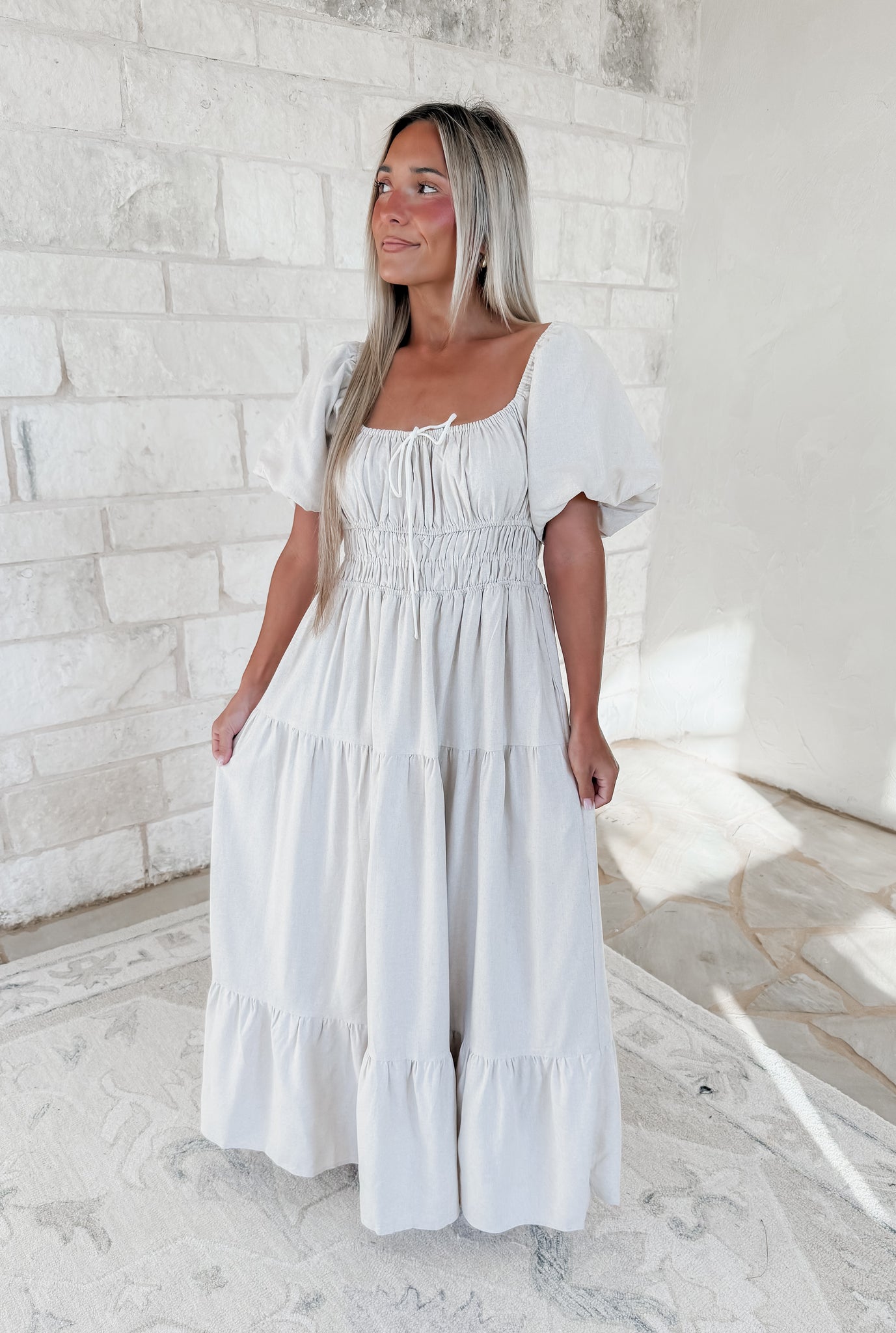 Maggie Vintage Ruffled Puff Sleeve Maxi Dress - Oatmeal