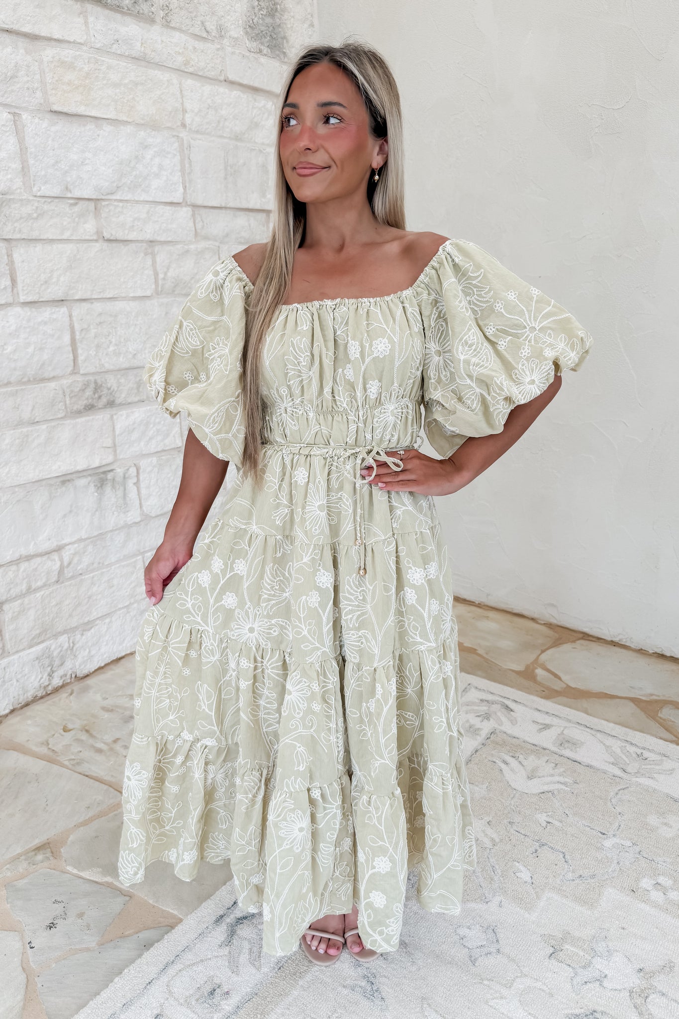 Only A Dream Jacquard Floral Puff Sleeve Midi Dress - Lt. Sage