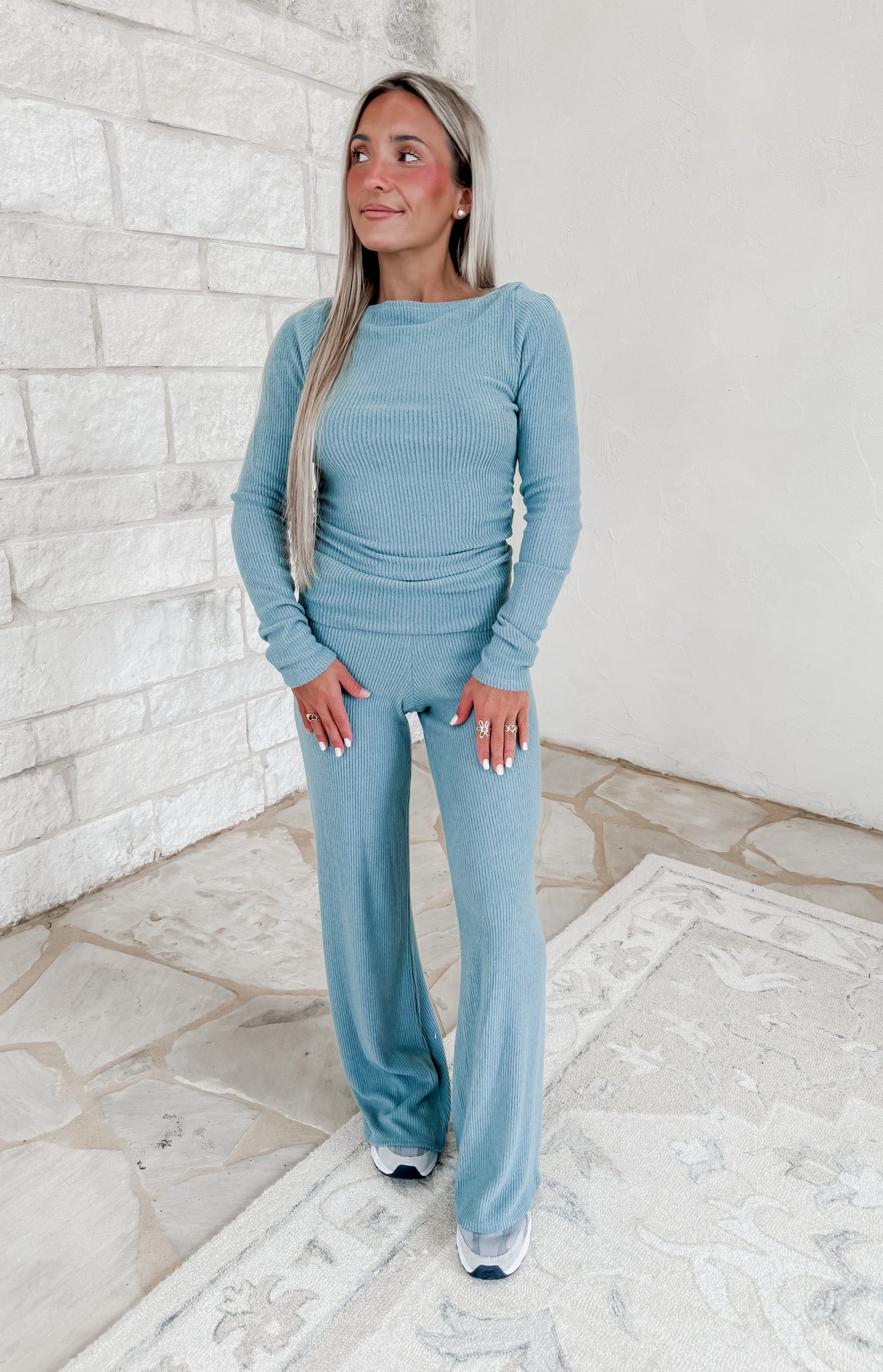 Adeline Knit Ribbed Boat Neck Top & Fold-over Pant Set - Teal