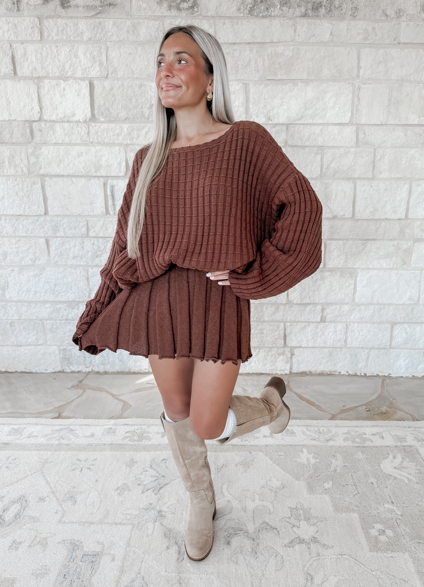 Stay The Path Long Sleeve Tunictop + Pleated Skirt Set - Brown